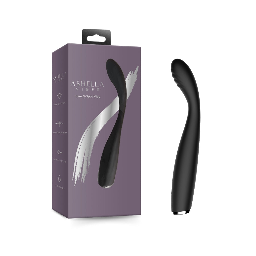 Looking to reach new orgasmic heights? Look no further than the Ashella Vibes Slim G-Spot Vibe. It's intense vibration, curvature shape and flexible design provides the ultimate comfort and climax. The slim G-Spot Vibe offers 10 powerful modes of vibration an d its textured shaft adds even more thrillinhg senastions to your g-spot, sure to leave your knees shaking.