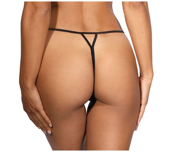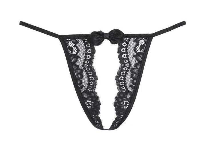 Delicate open crotch black lace G-String with frontal bow and traditional elastic V-string back.