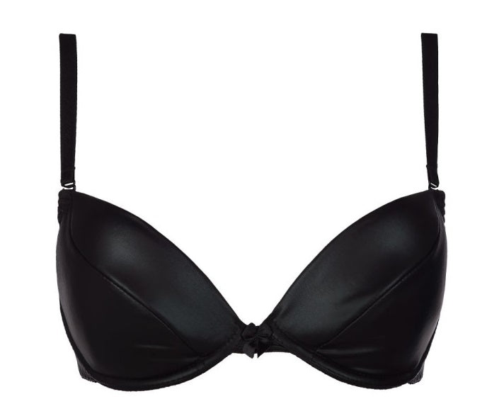 Sexy and daring black stretch wetlook push-up bra. Silky smooth, matte finish with removable pads and shoulder straps.