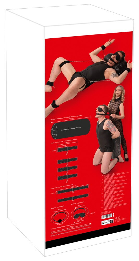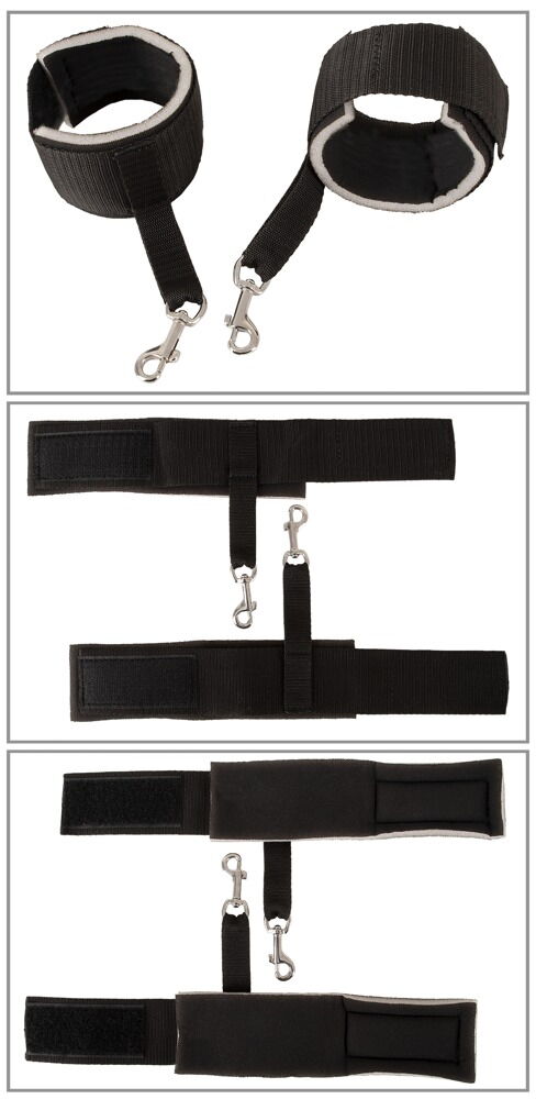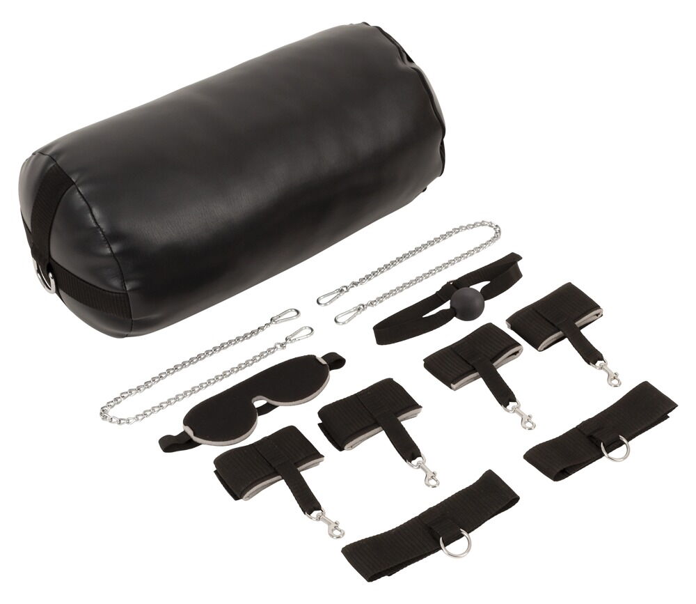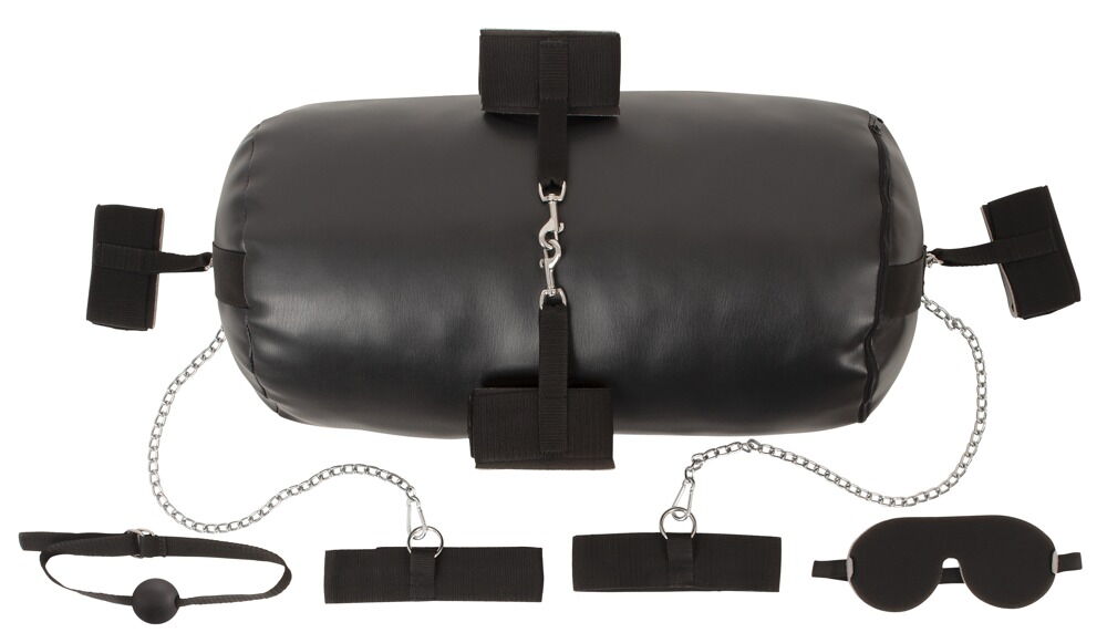 The two D-rings on the ends of the cushion can be used to quickly attach the included wrist and ankle cuffs with their snap hooks. Just like the two thigh cuffs with their two snap chains. The cuffs and straps can be quickly put on and taken off with hook-and-loop fasteners and are adjustable to fit. The included padded blindfold and ball gag add to the captivating experience. Both are also adjustable.