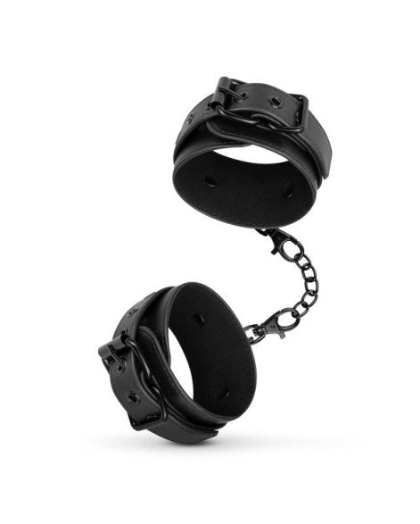These adjustable cuffs are made of durable faux leather and equipped with clip closures and a chain.