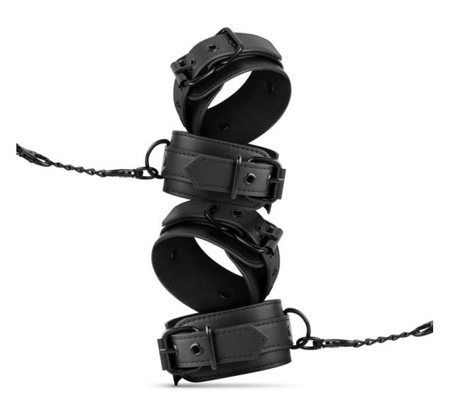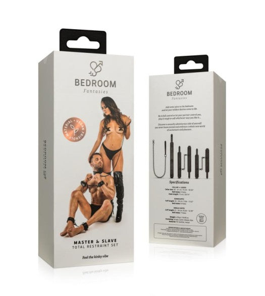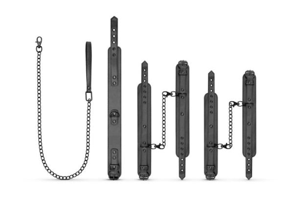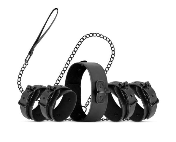 Take control of your sub with this kinky Total Restraint Set! The set includes a collar with leash, handcuffs, and ankle cuffs.