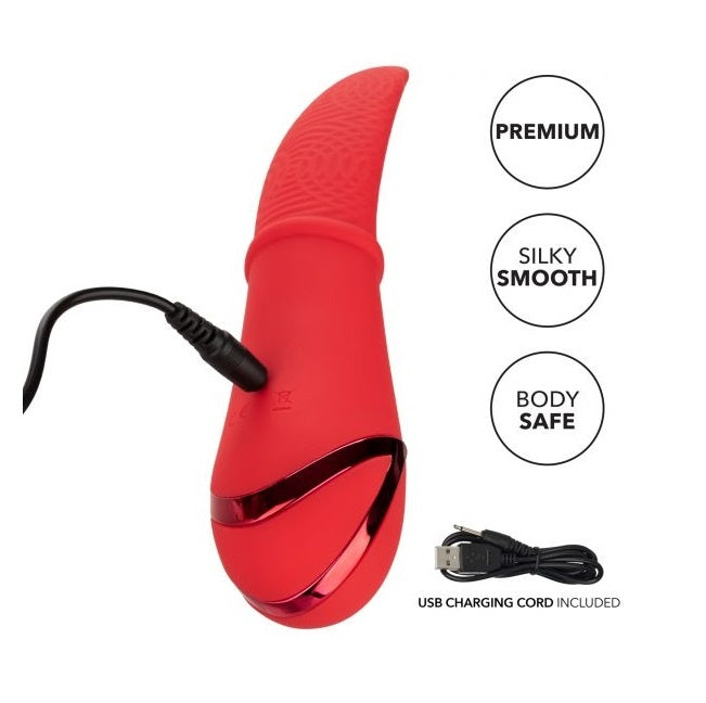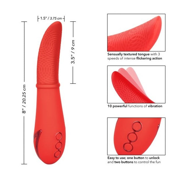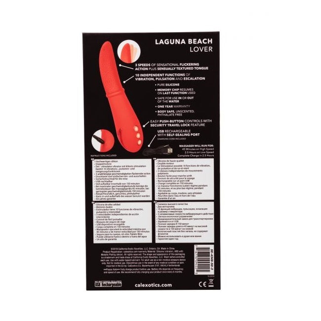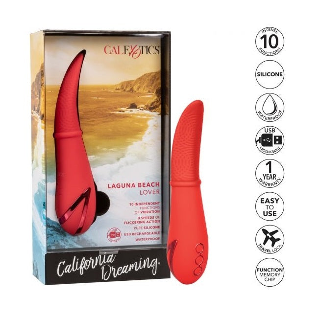 Indulge in wave after wave of pleasure as the California Dreaming® Laguna Beach Lover vibrator flickers against your most sensual sweet spots. The 10 intense vibration functions, flexible body and flickering tongue-like tip will make you feel like the star of the show. Indulge in knee-shaking stimulation with 3 speeds of flickering speeds packed inside the sensually textured tongue.