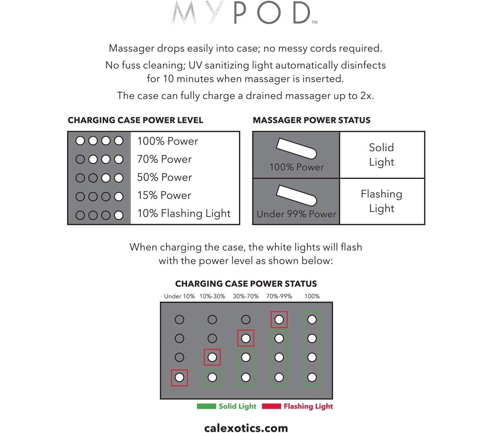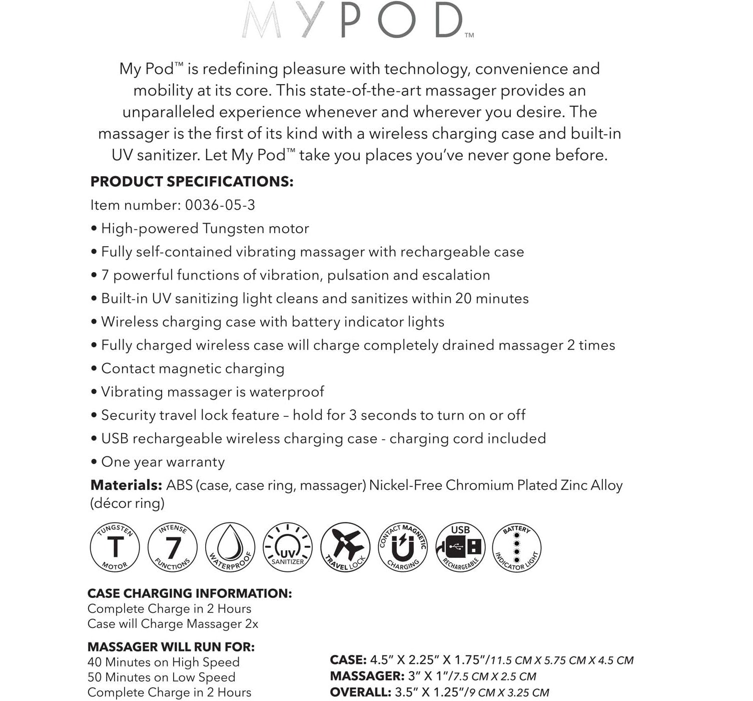 If you are looking for the absolute ultimate in pleasure, technology, and discreteness, look no further than My Pod™. This world-class adult toy offers 7 powerful functions of vibration, pulsation, and escalation through the extremely powerful tungsten motor with the click of a single button. Press to cycle through each of the individual functions, and a three-second hold to lock for easy travel. The vibrator charges wirelessly and automatically through contact magnetic charging from within its included carrying case, while automatically sterilizing the device through UV light when enclosed, cleaning and sanitizing in just 20 minutes. The fully-rechargeable carrying case will completely change in just 2 hours, and features four indicator lights to let you know exactly how much juice you have. This slim vibrator has no seams and is completely waterproof for an unparalleled pleasure experience whenever and wherever you desire. It’s extremely quiet design will run for 40 minutes on high speed and 50 minutes on low speed, and when you need a quick recharge, it takes just 2 hours. My Pod™ is redefining pleasure as one of the finest and most advanced adult toys on the market today.