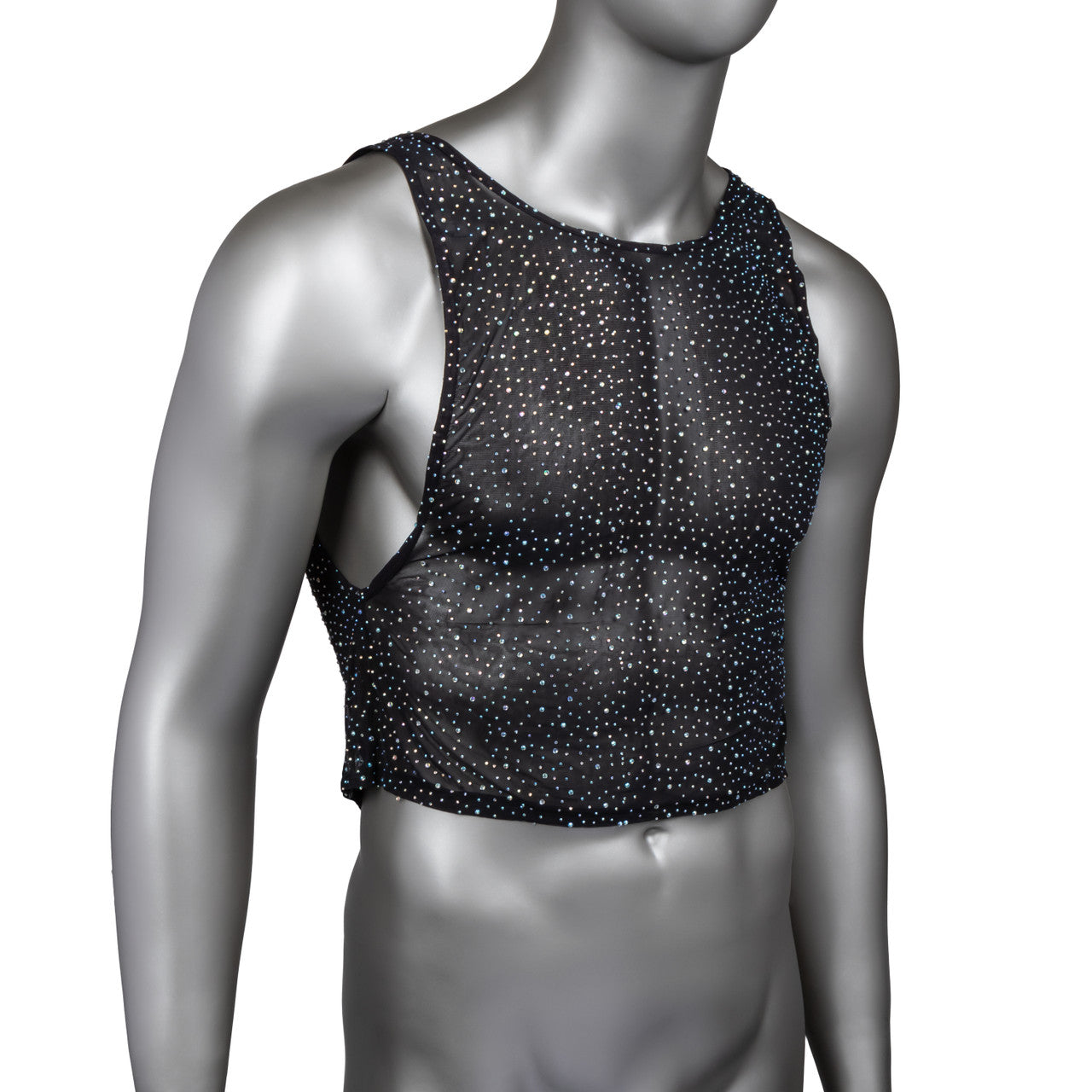 This comfy, breathable, barely-there mesh top bares your arms, and peek-a-boos (it’s sheer) your abs and chest as zillions of iridescent rhinestones twinkle away. Wear it solo or as a surprise layer under your favorite shirt for instant glam.