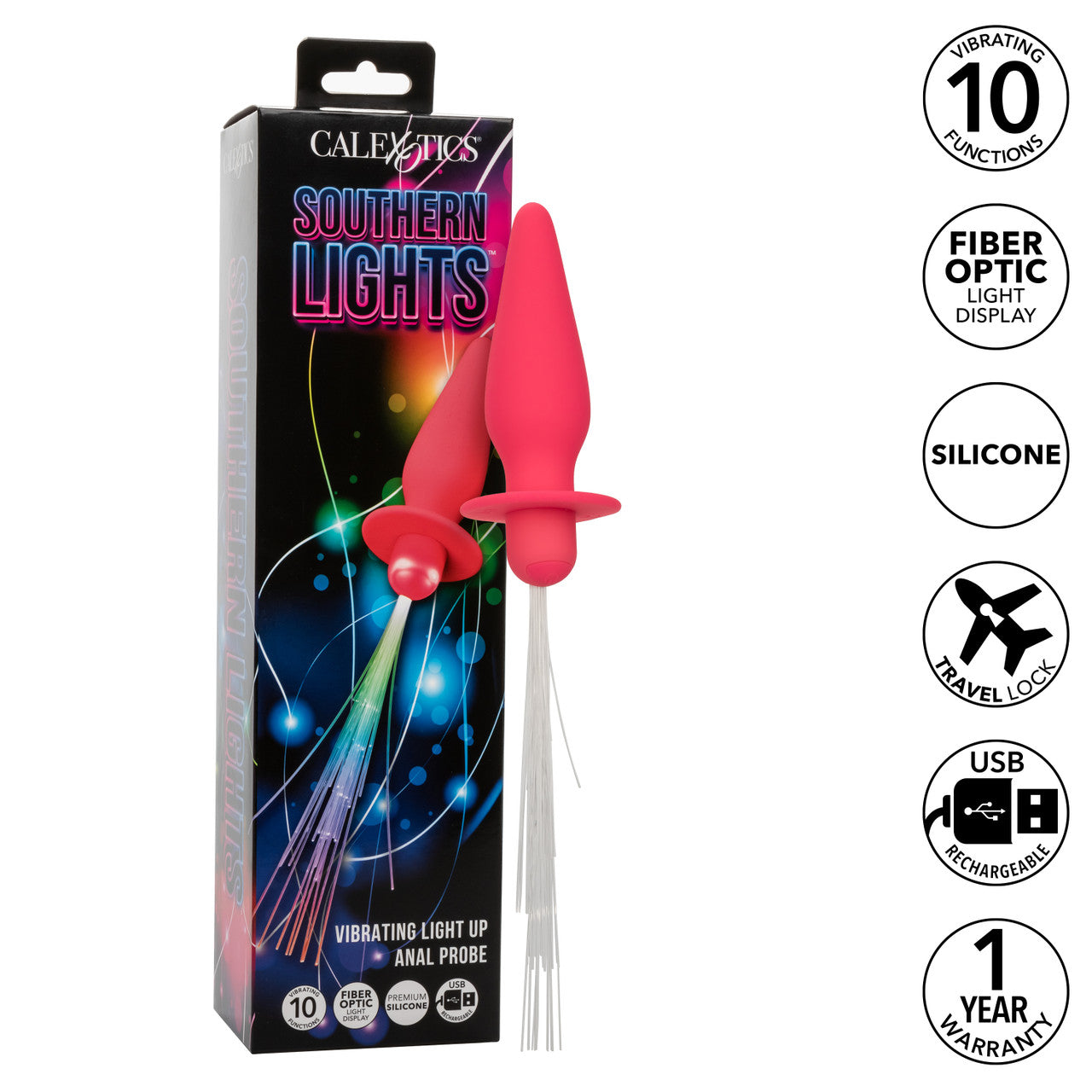 The unique feature of this device is its light-up fibers, which illuminate in sync with the vibrations. Each of the 10 intense functions of vibration, pulsation, and escalation adds a visual dimension to your pleasure, with the first function dedicated solely to a captivating light show. This fusion of light and sensation creates an immersive experience, making each moment with the Southern Lights™ probe a journey into a world of color and ecstasy.