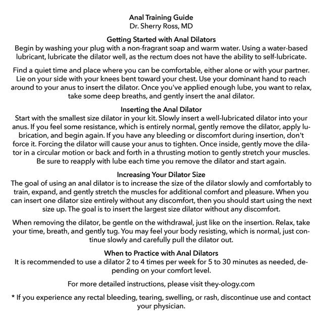 Best of all, the kit comes with a anal training guide, courtesy of Dr. Sherry Ross M.D, so you can learn where to begin, what to do, when to use your anal dilators.