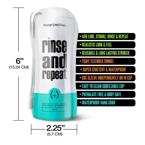 - The Happy Ending Rinse And Repeat Classic Stroker, Ass is made from a revolutionary new material that will change how you stroke. This new material becomes naturally slick when it's exposed to water – so slick that you don't need any lube! The next time you're taking a shower, take this handy stroker with you. Just add a few drops of water to make it super slippery and ready for play. The life-like opening is shaped like a big ole' booty to make your backdoor fantasies come true.