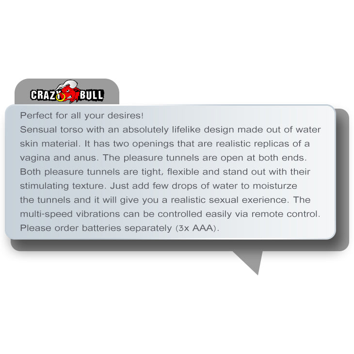 Sensual torso with an absolutely lifelike design made out of water skin material. It has two openings that are realistic replicas of a vagina and anus. The pleasure tunnels are open at both ends. Both pleasure tunnels are tight, flexible and stand out with their stimulating texture. Just add few drops of water to moisturze the tunnels and it will give you a realistic sexual exerience. The multi-speed vibrations can be controlled easily via remote control. Please order batteries separately (3x AAA).