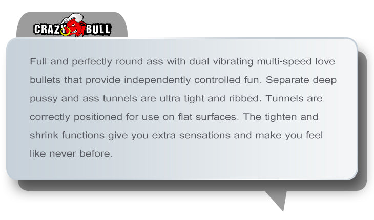 Full and perfectly round ass with dual vibrating multi-speed love bullets that provide independently controlled fun. Separate deep pussy and ass tunnels are ultra tight and ribbed. Tunnels are correctly positioned for use on flat surfaces. The tighten and shrink functions give you extra sensations and make you feel like never before.