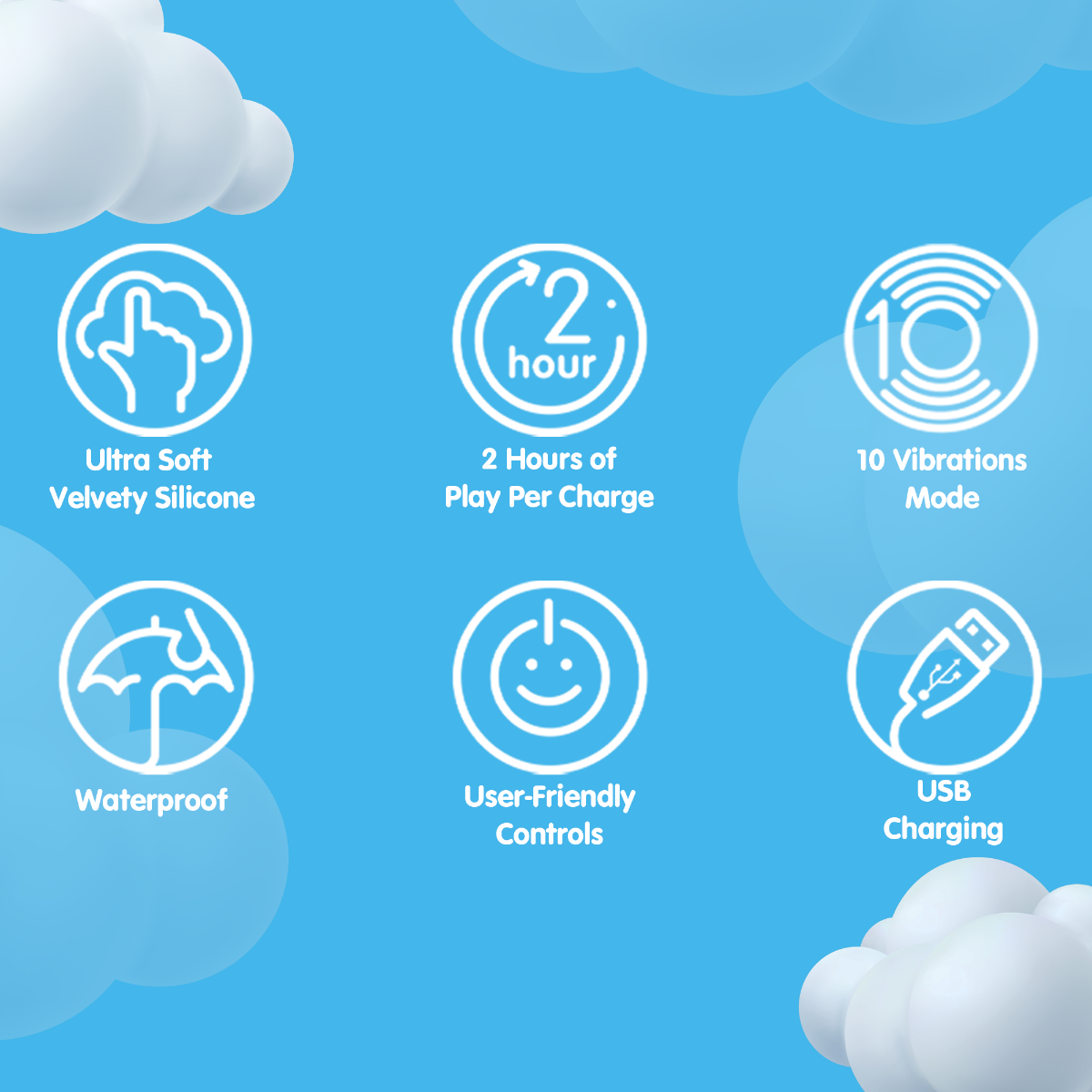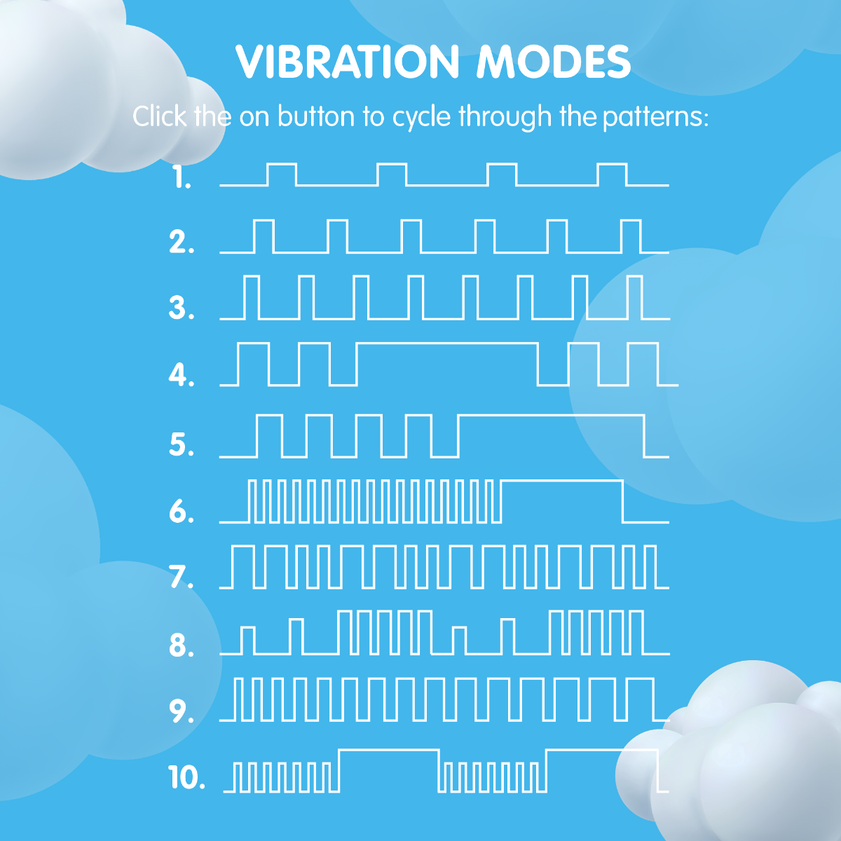 • Press and hold ‘on’ button for 2 seconds to turn on/off, click to progress through the 10 pleasure modes