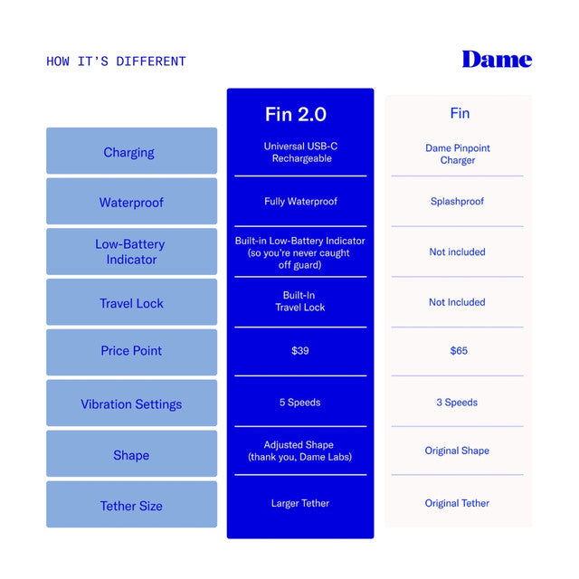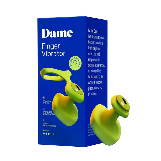 The Dame Fin 2.0 is an intuitive, finger-worn vibrator designed to enhance intimate touch during solo or partnered play. Crafted from medical-grade silicone, it offers a soft, body-safe experience. The Fin 2.0 features five intensity levels, allowing users to customize their stimulation. Its compact design includes a detachable finger strap for added versatility, and it's fully waterproof, making it suitable for use in various settings. The device is USB-C rechargeable, providing up to one hour of use on the highest setting. Included with the Fin 2.0 are a storage bag and user manual for convenience.