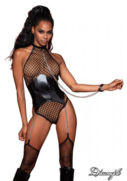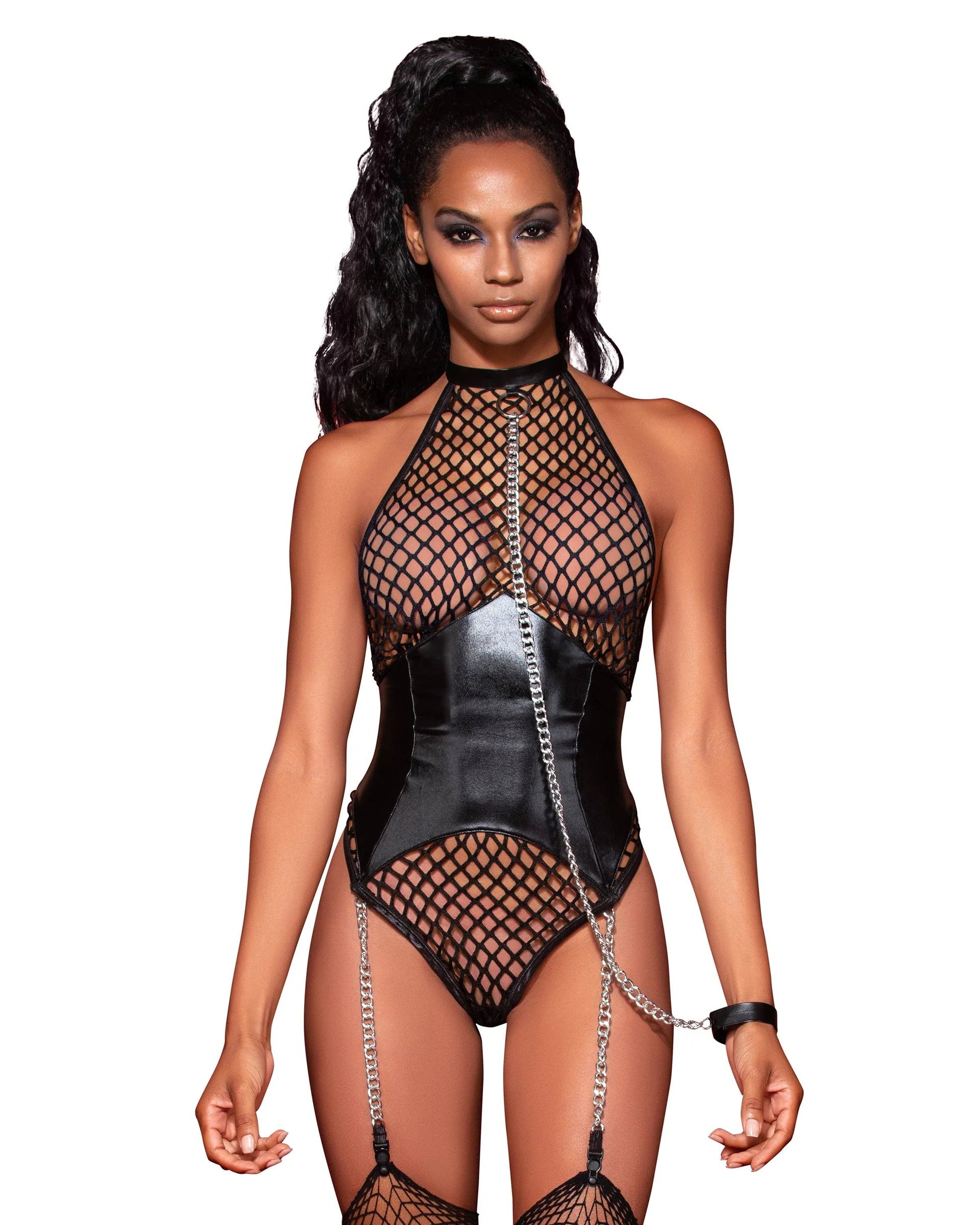 Dreamgirl Large Fishnet Corset-Style Halter Teddy with Attached Collar & Chain Leash Accent Black Size OS
