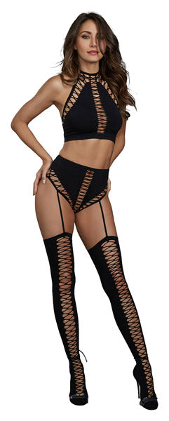 2PC bodystocking set.- Seamless opaque top with criss-crossed elastics along the front and back and a halter neckline with a snap neck closure,- High-waisted thong with a criss-crossed elastics along the sides and matching stockings attached by fixed garters