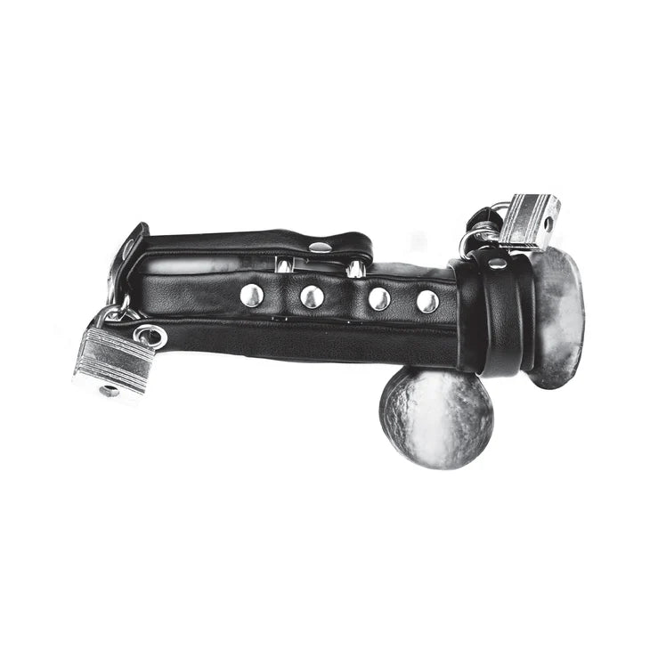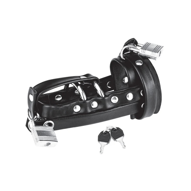 Gimp cock locking chastity sheath is the perfect way to put any penis in purgatory. The unique design is made of 2 steel rings and a locking attached strap. Lock that cock-up!