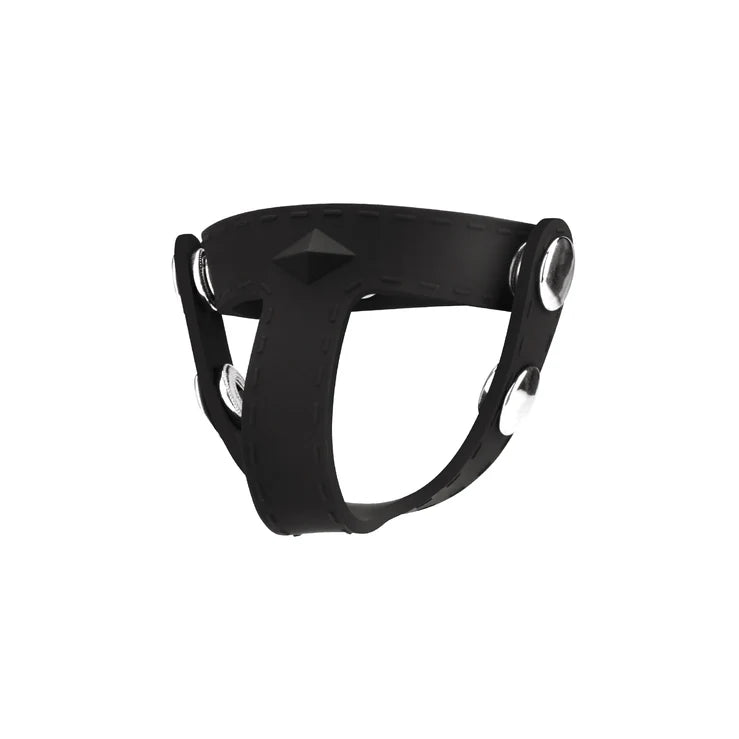 Place penis through silicone ring. Wrap thick silicone strap around base of cock and around balls. Snap at comfortable size.