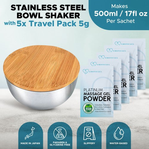 This product contains a stainless steel massage bowl with a 500ml/ 16.9oz capacity with a bamboo lid and air seal. A perfect combination to also include the 5g massage powder. These great little sachets allow the user to create their massage lotion. Perfect for travel and can be used to make 250ml of Platinum Massage Gel or 500ml/ 16.9oz of Premium Massage Gel. Depending on how much warm water you add, you can create the viscosity that suits you. Sprinkle over warm water and mix to remove lumps. Once made, it can be immediately used or stored for a minimum of 7 days without losing its properties.