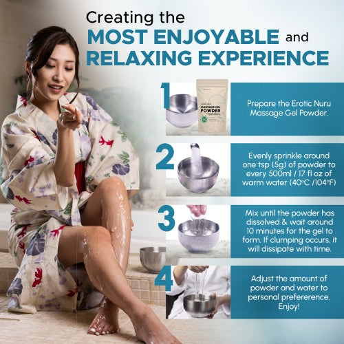 Personalize your massage experience by adding your favorite fragrances and essential oils to the gel powder, creating a blend that matches your unique preferences. Simply mix the powder with water to achieve your desired consistency, use only what you need, and store the rest in the resealable sachet to maintain maximum freshness and convenience. With the Sakura Edition Nuru Massage Gel Powder, every massage becomes a customized journey to relaxation and well-being.