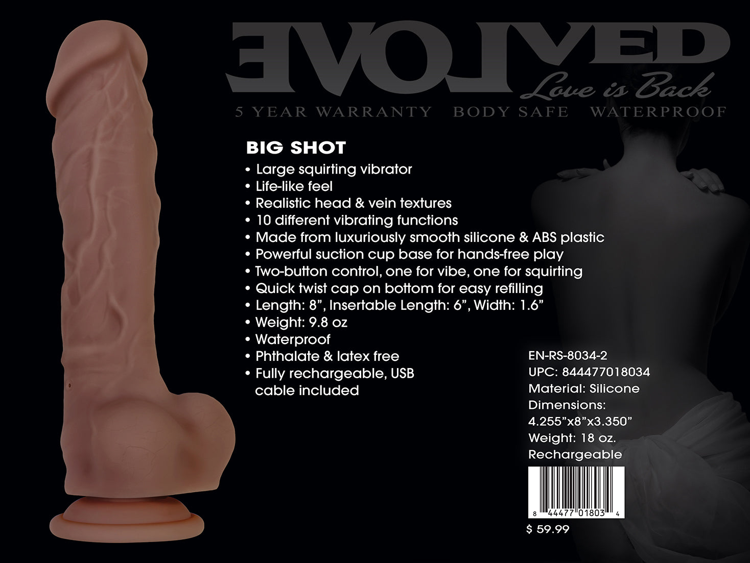 Get ready to fulfill your fantasies with this large, life-like multispeed vibrator that shoots out the fluid of your choice on command! With a very realistic head and vein textures that feel like the real thing, its sturdy suction cup base means you can enjoy vigorous hands free play through all 10 vibrating speeds and functions in the powerful shaft. When you’re ready for your ‘faux pop,’ you simply press the button to fulfill your fantasy! Fluid refills through an easy-to-use reservoir at the bottom, and the ergonomic two-button controls are right where you need them! Clean up this big fella with Evolved Toy Cleaner and a warm water rinse.