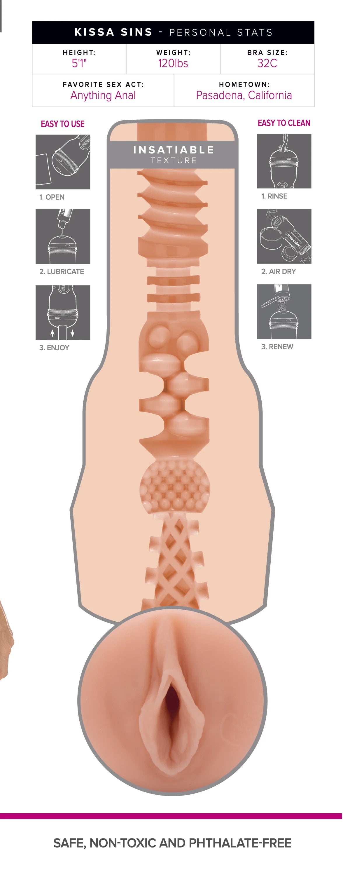 Kissa Sins doesn't have the typical profile of a pornstar you may find on Pornhub. She was born in California but spent much of her childhood in Canada. She did not get her start in the porn business until later than most girls and when she did finally hit the adult entertainment spotlight, she was destined for stardom. She knows how to push the limit with her daring and adventuresome sexual escapades. Having been nominated and awarded several XXX accolades including those of XBIZ and AVN acclaim, Kissa, who is known for her hardcore and downright wild performances continues to push the envelope. Whether she is softly partaking in a sensual and romantic rendezvous or being spanked and banged by multiple dudes at one time, Kissa enjoys every single encounter. There is no stopping this thirty-something beauty who loves eating ass more than anyone we have ever known. What will YOU do with your Kissa Sins Fleshlight?