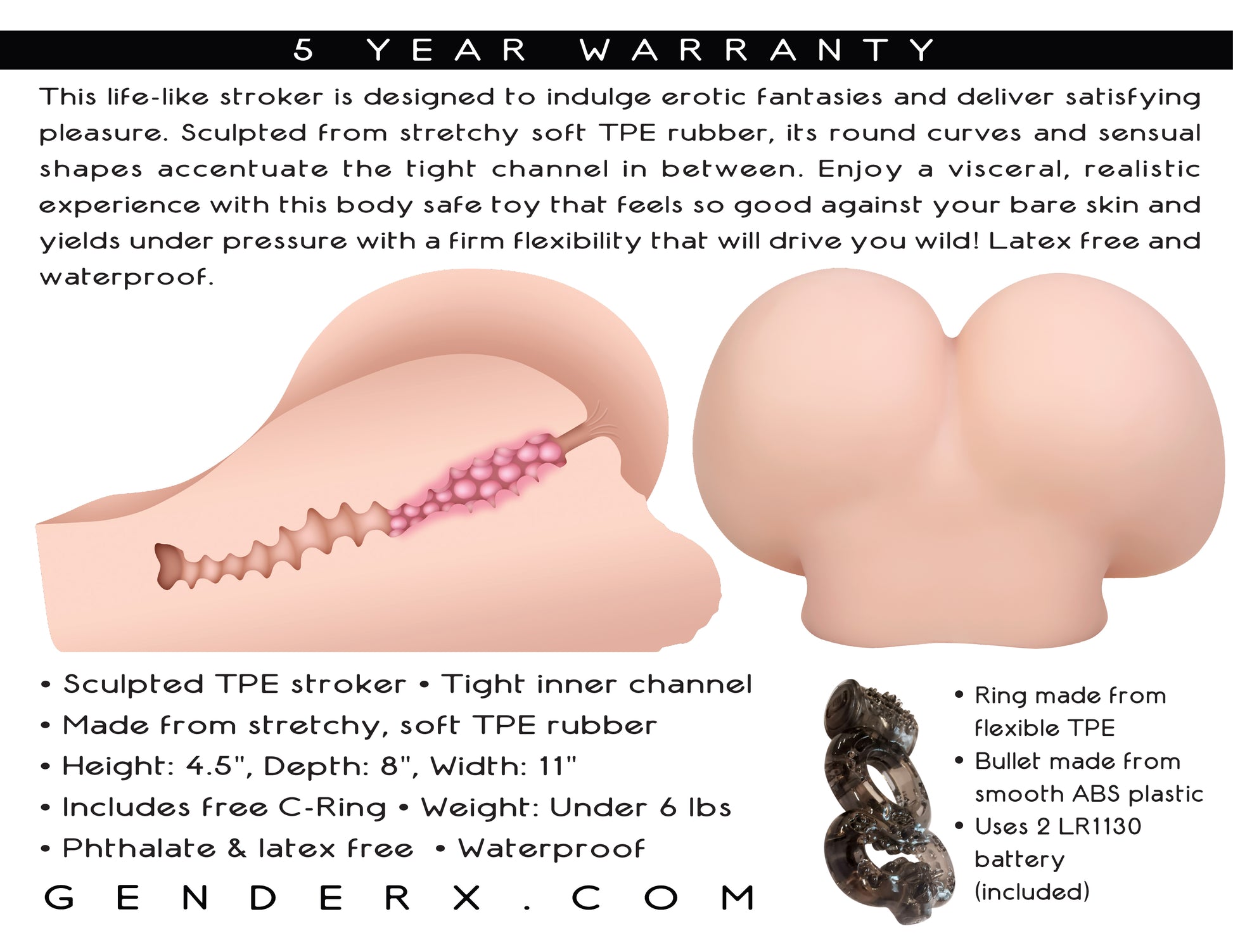 This life-like stroker is designed to indulge erotic fantasies and deliver satisfying pleasure. Sculpted from stretchy soft TPE rubber, its round curves and sensual shapes accentuate the tight channel in between. Enjoy a visceral, realistic experience with this body safe toy that feels so good against your bare skin and yields under pressure with a firm flexibility that will drive you wild! Latex free and waterproof.