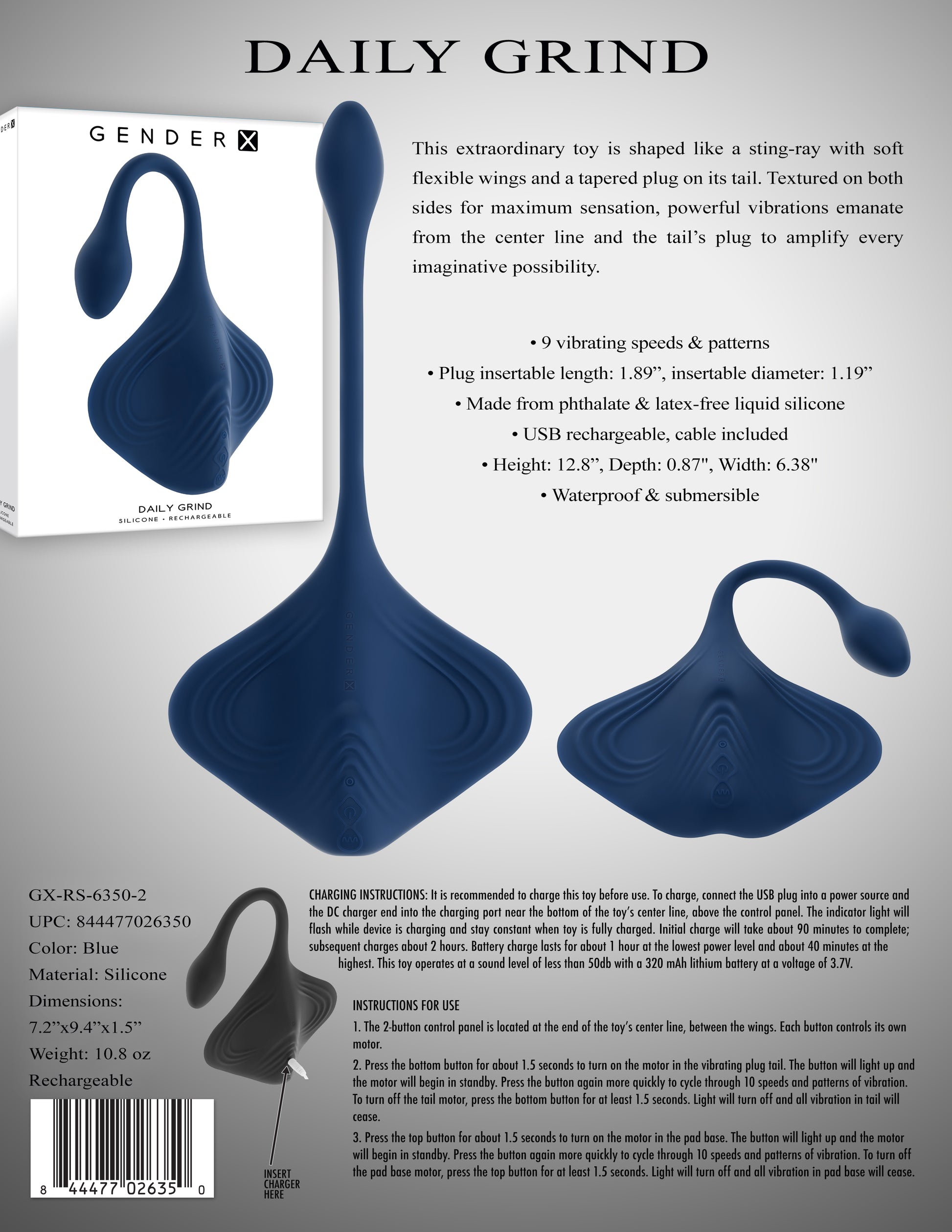 This extraordinary toy is shaped like a stingray with soft, flexible wings and a tapered plug on its tail. Textured on both sides for maximum sensation, powerful vibrations emanate from the centre line and the tail's plug to amplify every imaginative possibility.
