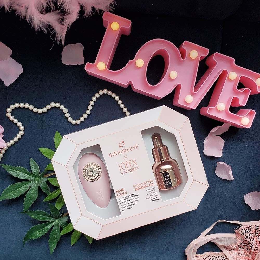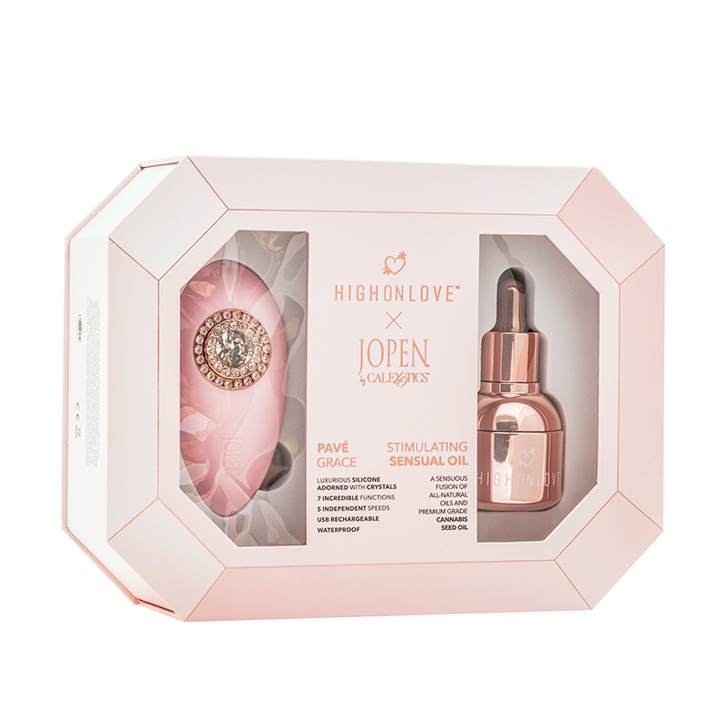 - THIS GIFT SET includes the JOPEN Pave Grace personal massager made of luxurious silicone and adorned with crystals and the HighOnLove Stimulating Sensual Oil (30ml), a sensuous fusion of all-natural premium oils.