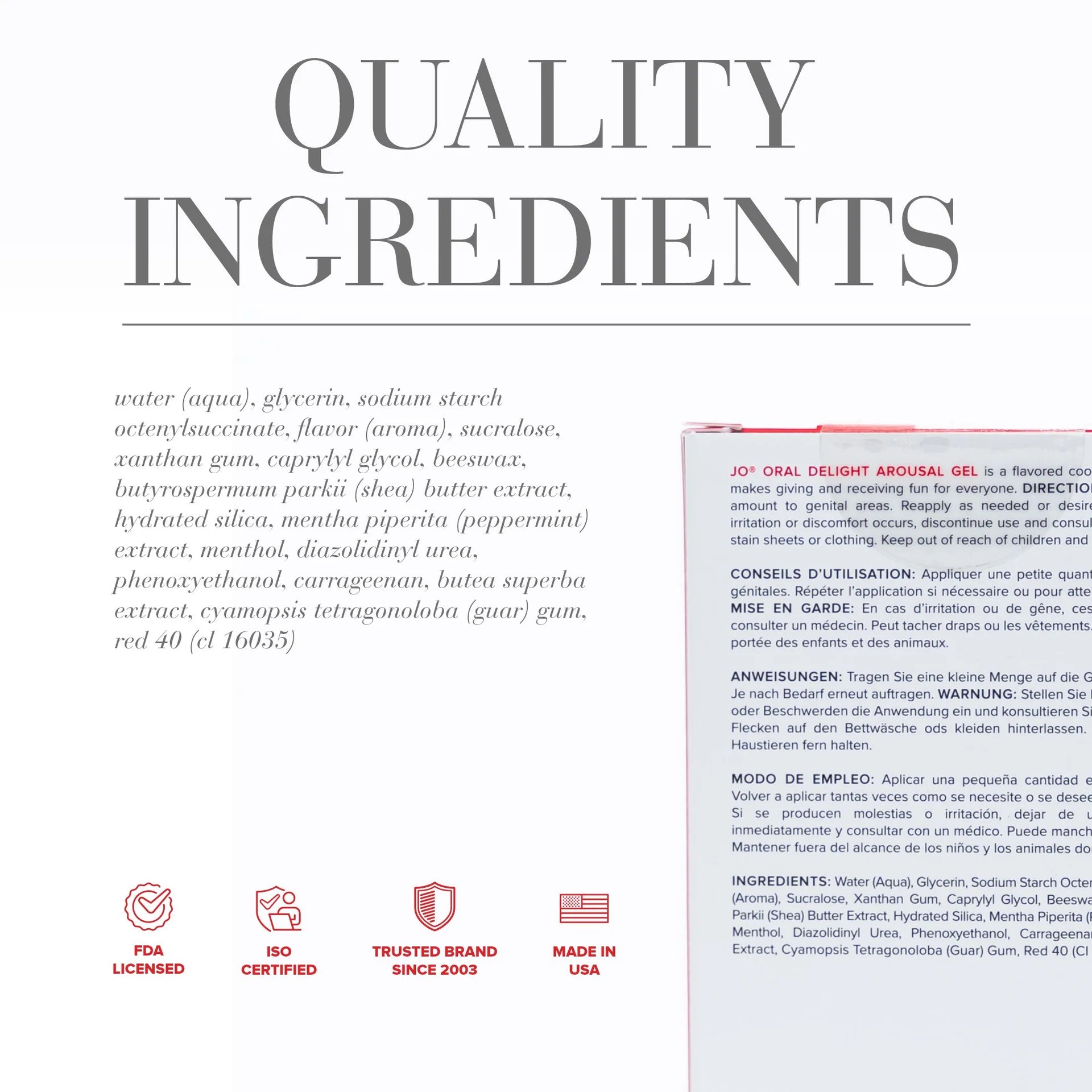 JO Strawberry Oral Delight Arousal Gel is our water-based, flavored stimulant that's perfect for oral play of all kinds. Its thick formula is great for extended use, stays where you put it, and offers a fruity cooling tingle that lasts as long as you do.