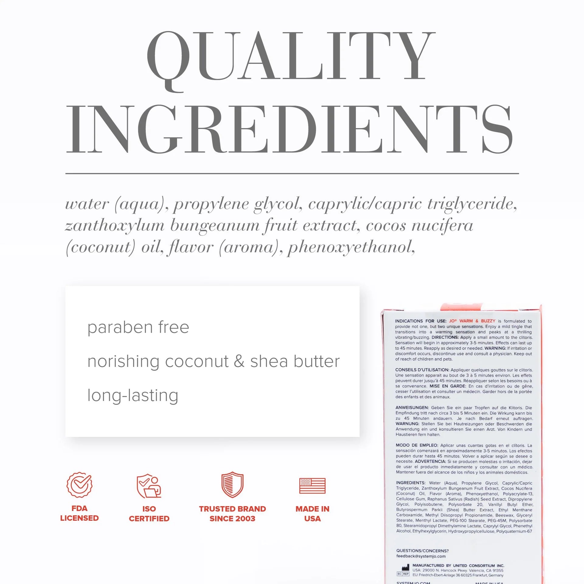 JO Warm and Buzzy is formulated to be the complete sensation package with not one but two unique sensations. Enjoy a mild tingle that transitions into a warming sensation and peaks at a thrilling vibrating/buzzing.