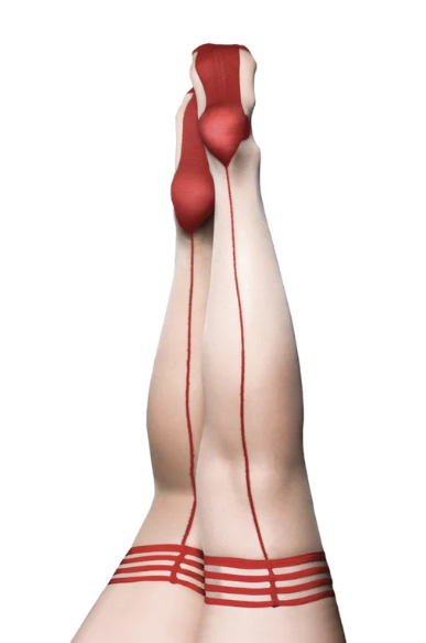 Sheer nude thigh-highs with a red band and red back seam! Classy with a little sassy. The Whitney's are perfect for holidays, going out, or staying in! A day to night wardrobe essential, back-seamed thigh-highs are the perfect way to kick it up a notch. Kix'ies thigh-highs are designed for all-day wear, with a no-slip-grip. We offer Petite to Plus Size Stockings and are the #1 thigh-highs that stay up!