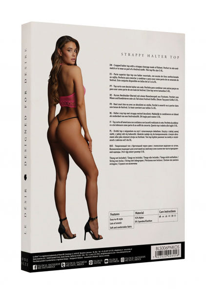 Cropped halter top with a strappy cleavage made of fishnet. Perfect to mix-and-match or to wear as part of a festival outfit. This top fits size S-XL. Thong not included.