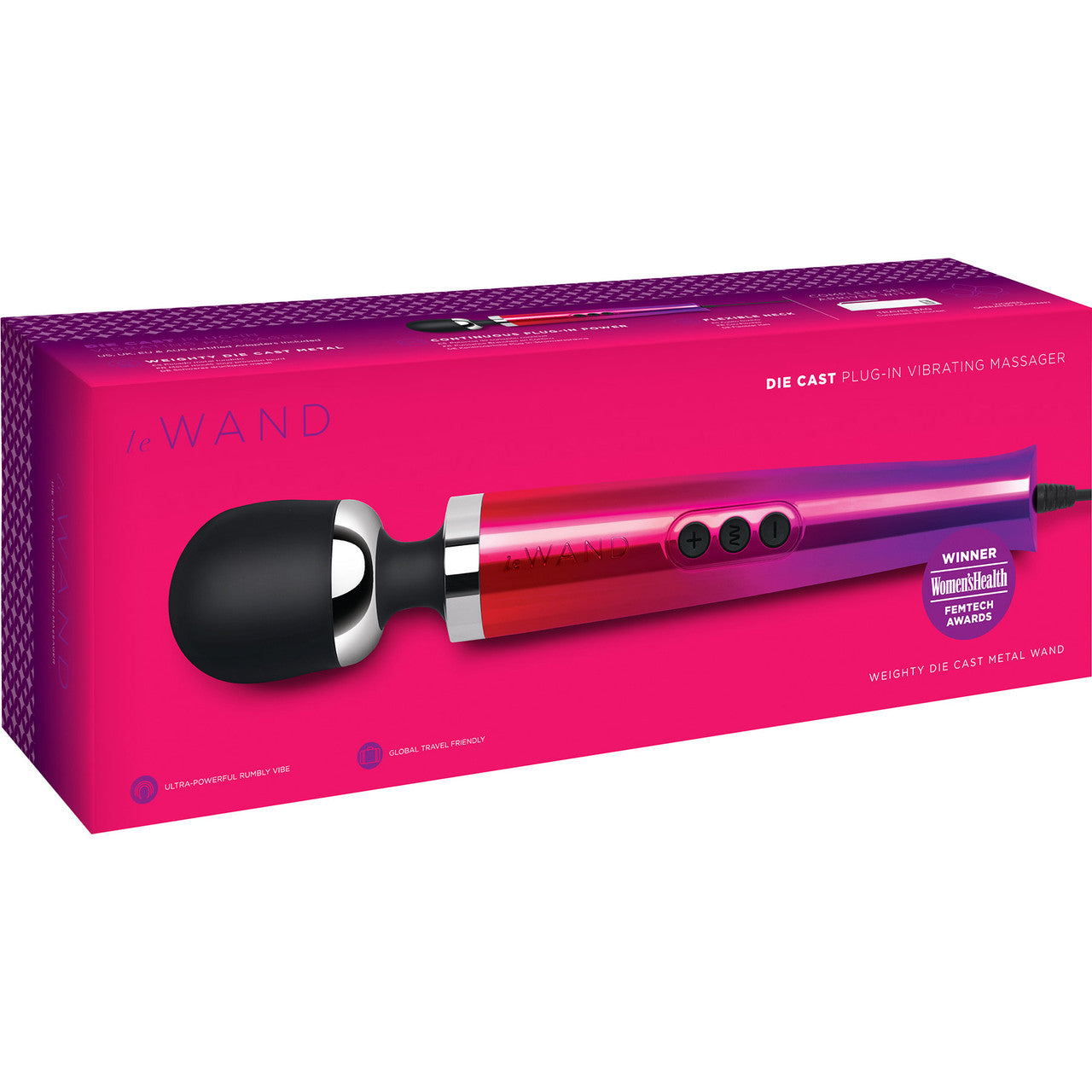 Plug-in for our most powerful wand yet! Le Wand Die Cast Plug-In Vibrating Massager is a heavier, more powerful adaptation of our award-winning wand. Featuring a cast metal body and amplified motor, this massager is perfect for those looking to take their pleasure collection to the next level.