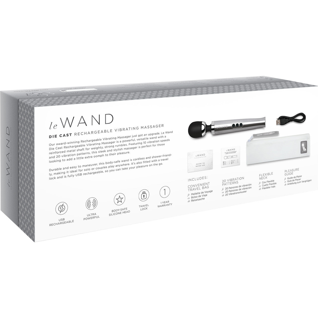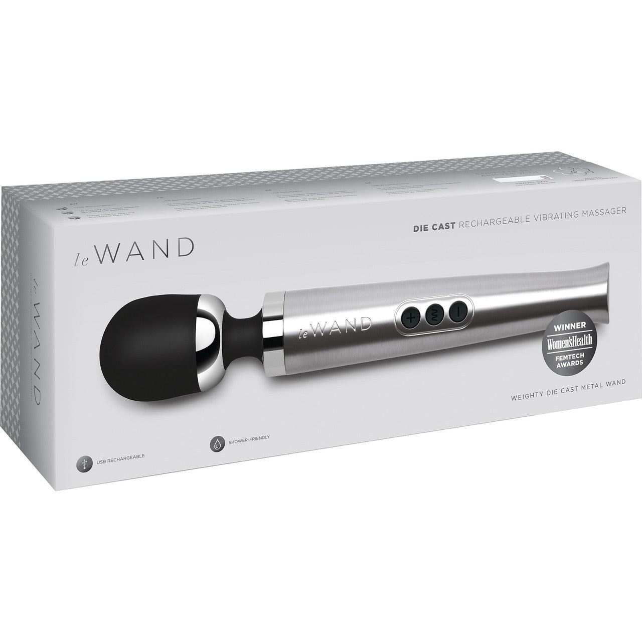 Our award-winning Rechargeable Vibrating Massager just got an upgrade. Le Wand Die Cast Rechargeable Vibrating Massager is a powerful, versatile wand with a reinforced metal shaft for weighty, strong rumbles. Featuring 10 vibration speeds and 20 vibration patterns, this sleek and stylish massager is perfect for those looking to add a little extra oomph to their pleasure.