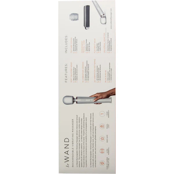 Le Wand Rechargeable Vibrating Massager is a complete wand vibrator set that includes a body-safe silicone head, a 360° flexible neck, a multi-use disposable texture cover, a convenient travel case, and luxurious giftable packaging.