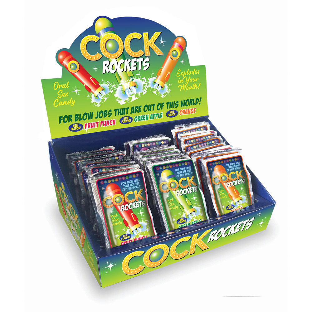 Each POP display comes with 12 packs of each of the new flavours: fruit punch, green apple, and orange. Upgrade your BJ today with Cock Rockets oral sex candy!