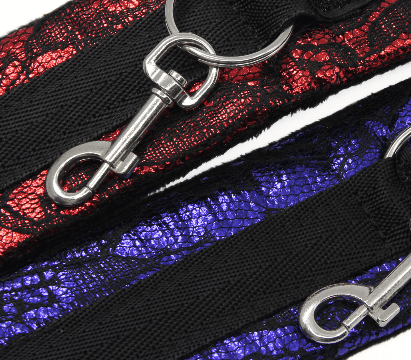 Each cuff sports a 2.5cm O-ring and single sided snap which can be used to connect you choice of chain or attach to a hogtie