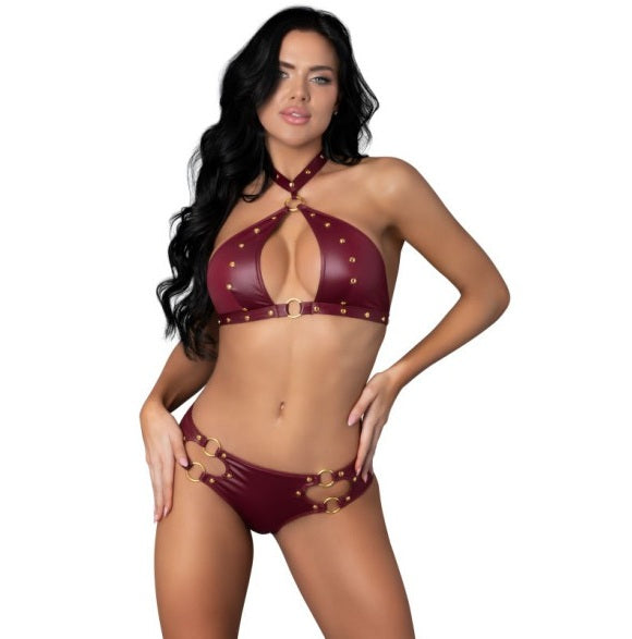 This daring two-piece features a striking choker bra with a provocative open keyhole front, embellished with gold studs and ring accents. Designed for both allure and comfort, it secures with a velcro neck closure and a back clip closure.