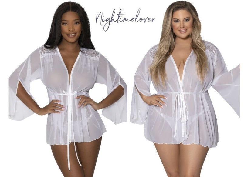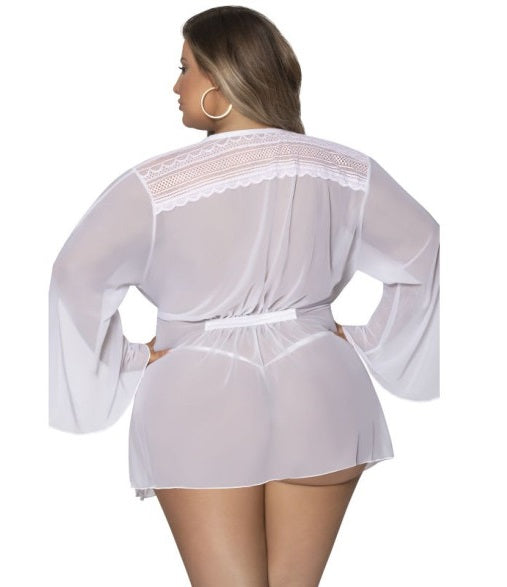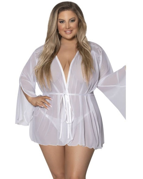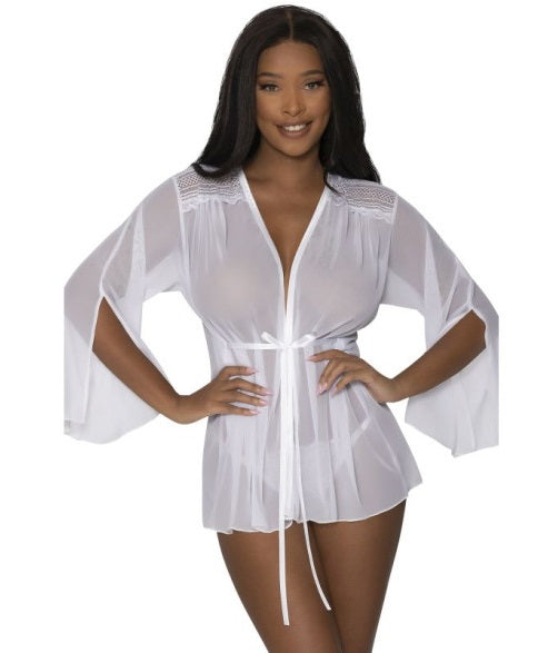 From the Exposed by Magic Silk collection, this style includes: a thigh length robe featuring breathable mesh, lace across the shoulders, flowy bell style full-length side slit sleeves, a ruched accent in the back, and an attached silky ribbon tie waist.