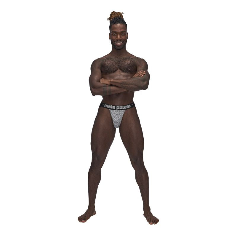 From the Sexagon collection by Male Power the Strappy ring jock with deluxe elastic back straps, including a y back thong strap, frames the exposed rear. Nickel plated rings and a plush branded printed waistband.