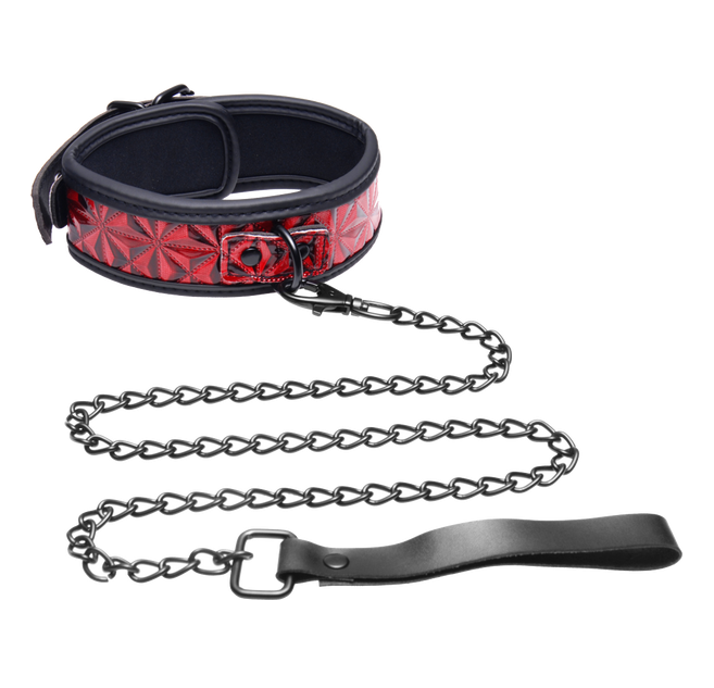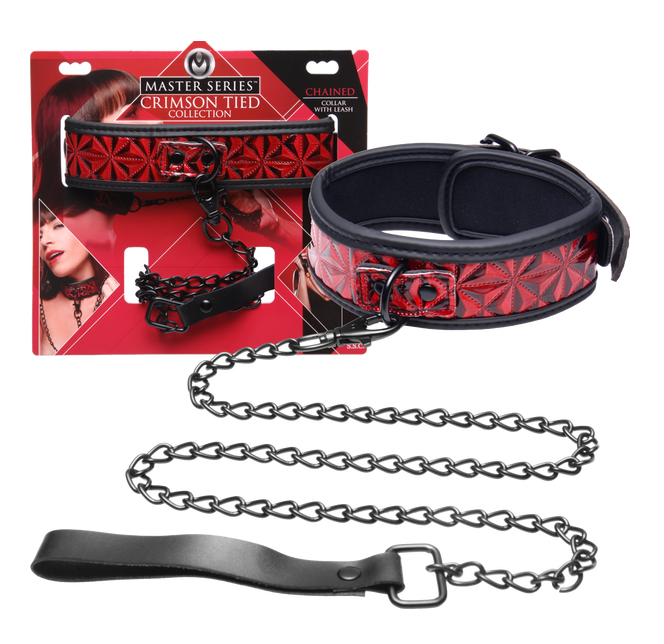 Allow yourself the freedom of relinquishing control with the Crimson Tied Leash and Collar Set from the Master Series. The collar features a sleek and sexy red and black embossed design, and is lined with soft padded neoprene. The all black hardware is nickel-free. Fully adjustable with the simple, belt style buckle and connected to a removable 30 inch long black chain, your plaything will look stylish and enticing...