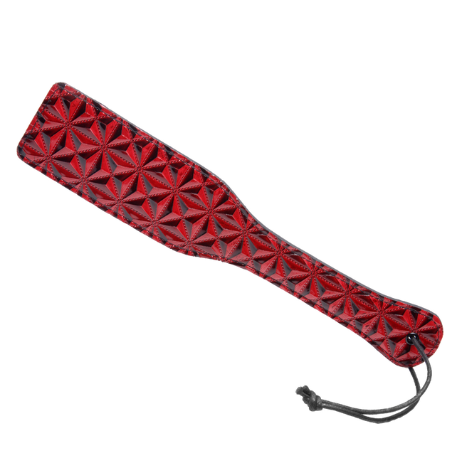 Perfect for disciplining your naughty plaything, this stiff paddle features a steel enforced design. The exterior is embossed with a red and black diamond pattern on one side, and a smooth faux leather on the other. The handle has a loop for hanging or to wrap around your wrist while you administer their punishment...
