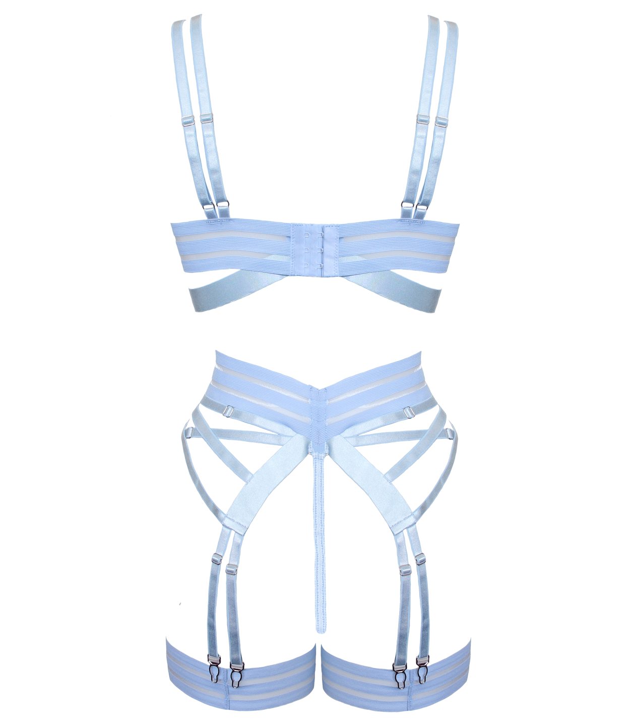 Muse Lingerie 4 Piece Bra, G-String, Garter Belt, Two Leg Straps Set Blue Size S/M/L