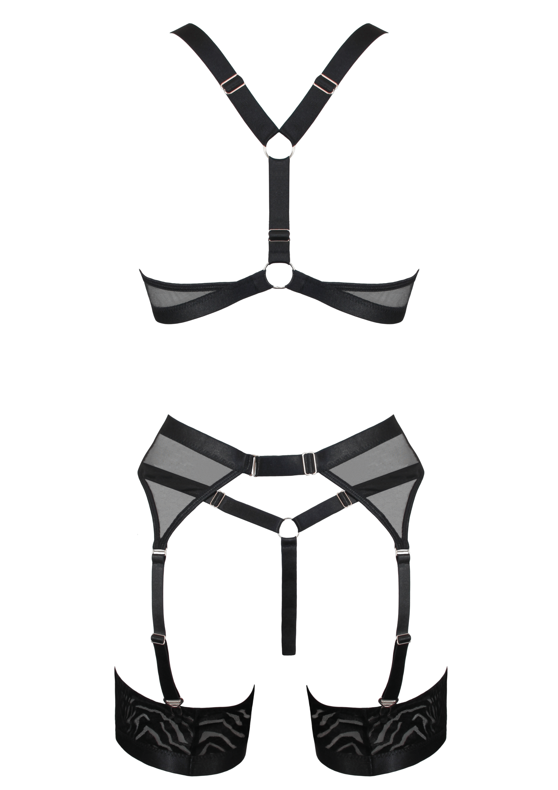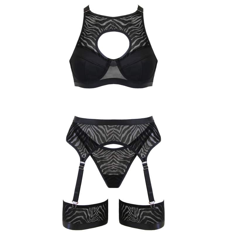 This 5-piece, mesh lingerie set is striped with a velvet-flocked Zebra print for a sexy and energetic vibe. Infused with sporty design elements, the longline bra features a circular cut-out in the front and a racer back, and is accompanied by a high cut g-string and garter belt. Thigh bands attach to the garter belt for a bold and contemporary look or can be removed for the addition of thigh-high stockings.