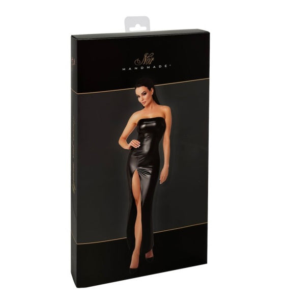 This strapless gown is a striking statement of sleek elegance and modern design. Crafted from Stretchy Power Wetlook fabric, this dress is made for those who want to make a bold impression. Its minimalist design highlights the body's natural shape, offering a refined and confident look. The Stretchy Power Wetlook fabric contours the body, emphasizing curves with a smooth, matte finish. It's strapless design has a clean, straight neckline that accentuates the shoulders and decolletage. It has a high-high slit that adds an element of intrigue, allowing for ease of movement while maintaining a sleek silhouette. The dress is tailored to perfection, the gown creates a smooth, streamlined silhouette that flatters the figure beautifully