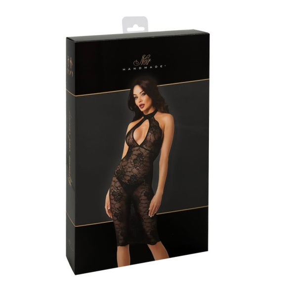 This lace dress combines elegance with a touch of boldness, making it an eye-catching choice for any special occasion. Crafted from elastic lace, this piece is designed to offer a figure-hugging fit while maintaining a delicate and sensual look. It has elastic lace that is soft against the skin and provides a transparent, enticing effect. The halter neck style with a deep keyhole cutout at the front adds a striking visual element. The dress is tailored to follow the contours of the body, accentuating the waist and hips while offering comfortable wear, it falls just below the knee, providing a balanced look between elegance and seduction