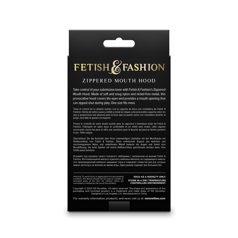 Take control of your submissive lover with Fetish & Fashion’s Zippered Mouth Hood. Made of soft and snug nylon and nickel-free metal, this provocative hood covers the eyes and provides a mouth opening that can zipped shut during play. One size fits most.