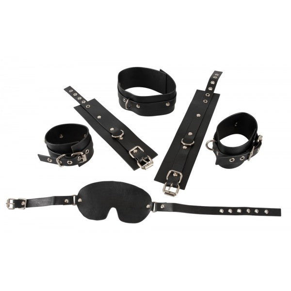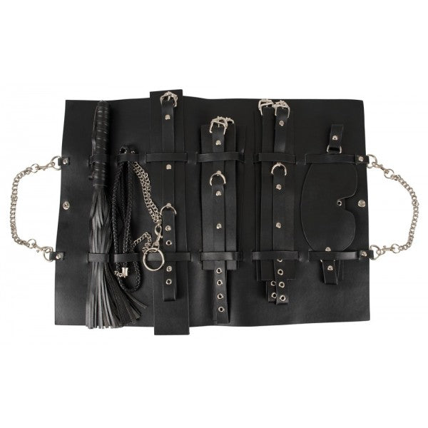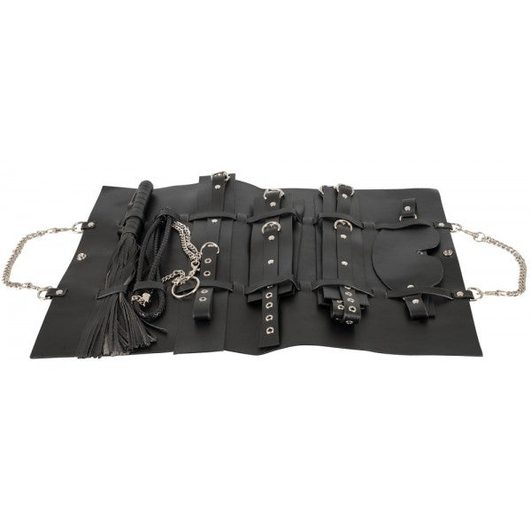 This 11-piece fetish set contains hand and ankle cuffs, collar and leash, eye mask and whip, as well as a bag in which all utensils can be stored. Perfectly suited for extended fetish games and always ready to go in the practical bag with press stud.