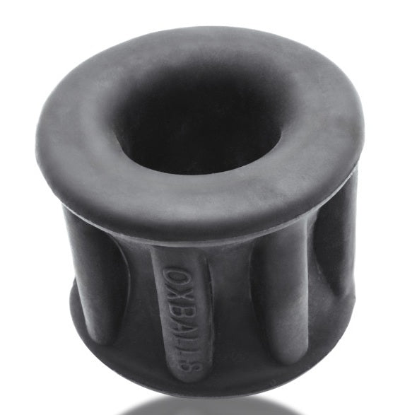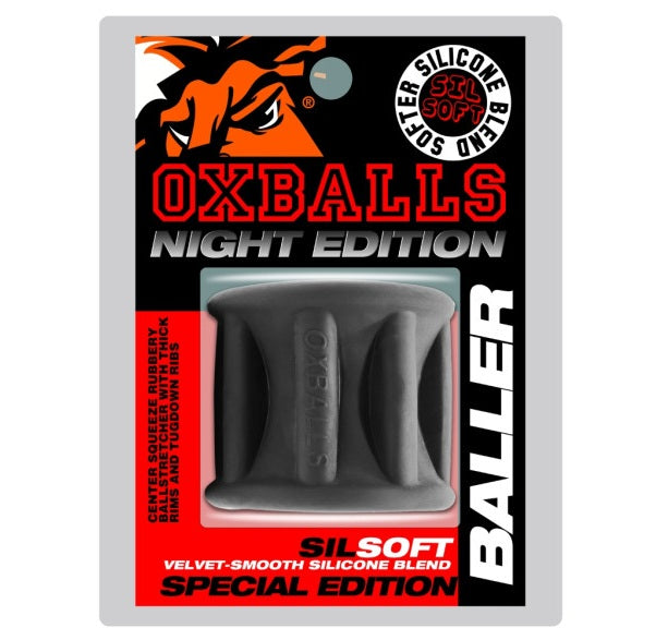 OXBALLS BALLER rib-stretch NIGHT EDITION max-tall ball stretcherin our lush rubbery SILSOFT SILICONE blend and a smooth,velvet-black color. This is a softer, squishier formula forthe hardest and darkest of play.BALLER soft stretchy blubbery hourglass-curving ballstretcher with eight super-stretch outer ribs for max push-down stretch, ataller ballstretcher for lower-hanging sacks—the rubbery ribs keep the squeeze down-low, so itfeels like grippy tugging thelength of your sack.