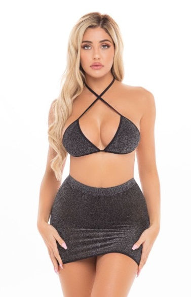 All that glitters is bold. This stunning Cherry 2-Piece Skirt Set pairs sexy and blingy fabulously. The halterneck bra helps highlight and enhance your cleavage. Meanwhile, the sparkling sheer mini skirt hints at what lies underneath.