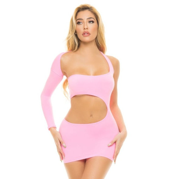 Features graphic mid section cut out and one long sleeve for that extra sensual vibe.